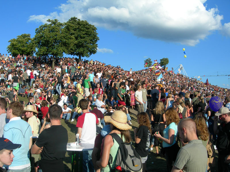 Am Sonntag war ich auf dem Fest in Karlsruhe. Es war richtig voll dort. Anfangs schlenderten wir etwas über das Gelände und holten uns Steak-/Frikadellenbrötchen, wo uns dann auch die Jungs von den Fantastischen 4 über den Weg liefen. Die schlenderten auch ein bisschen übers Gelände. Gegen 21:30 Uhr legten die 4 dann auch richtig los auf der Bühne. Während meine Begleiterinnen sich immer weiter den Hügel hinaufkämpften, blieb ich lieber unten. Das waren mir alles viel zu viele Menschen auf zu engem Raum (und auf dem Bild ist es noch gar nicht richtig voll gewesen!). Während des Fanta4-Konzertes schlenderte ich eine Runde übers Gelände, holte mir was zu trinken, aß ein Stück Pizza und schaute mir die Stände an. Es war zu dem Zeitpunkt bedeutend angenehmer, da ja sonst fast alle vor der Hauptbühne standen. Ich trank außerdem das Bier. Dann stand ich noch ca. 45 Minuten am rückwärtigen Hang des Hügels und lauschte den Fantas, bis sie sich gegen 23 Uhr verabschiedeten. Die Show war ganz gut, aber das Publikum ist nicht so meines. Wenn man bedenkt, dass ich sonst eher Musik à la Wacken höre, gibts da doch... nunja... kulturelle Unterschiede. Barfußläufer, Glöckchenträger, Rastafrisuren, etc. pp. sind nicht gerade die Dinge, mit denen man mich begeistern kann.